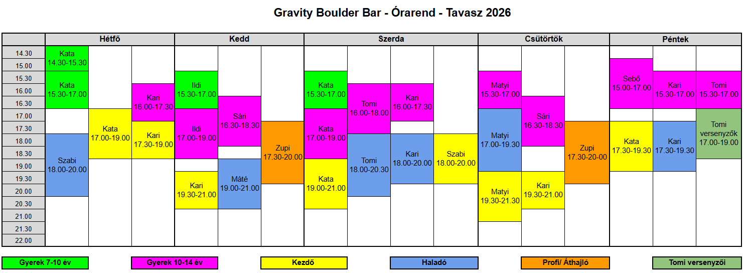 Tomi szerdai edzései: 16:00–18:00 között a 10–14 éves korosztálynak, majd 18:00–20:30-ig a haladó csoportnak tart foglalkozást.